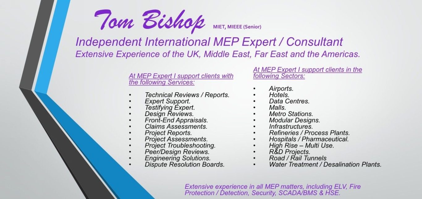 Operating as an Independent Expert, I provide International and UK Expert Witness services in Mechanical, Electrical, Plumbing and Drainage (Hydraulics), ELV systems and Fire Detection and Fire Protection systems.